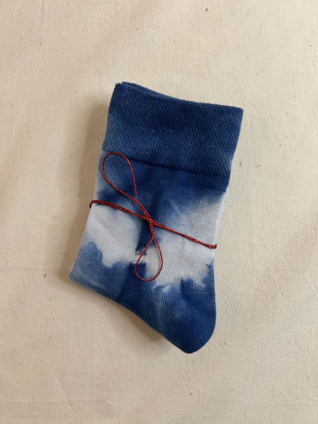 Chaussettes confortables et respirantes, teintes artisanalement à l’indigo.