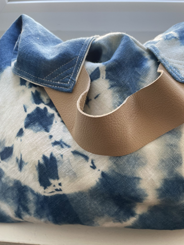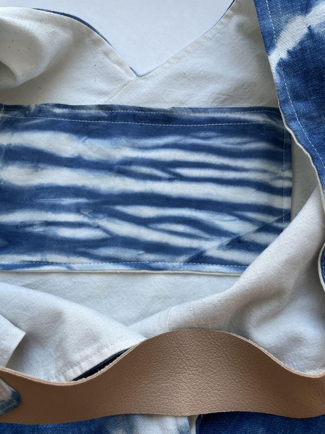 Inspiré de l’art du pliage japonais, ce sac origami est teint artisanalement à l’indigo végétal, selon la technique du Shibori, créant des nuances unique à chaque pièce.